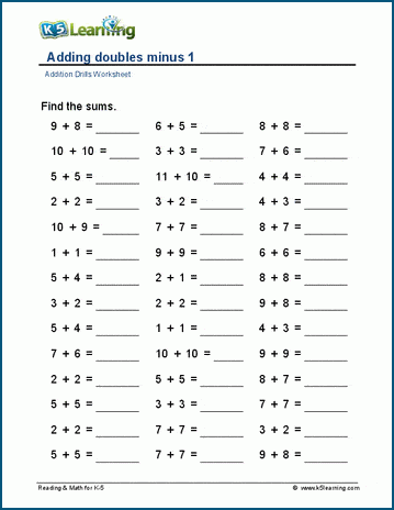 Students add doubles and doubles minus 1 (e.g. 4 + 4, 4 + 3) with addends from 1-10. Horizontal and vertical formats. Practice after mastering adding doubles.
