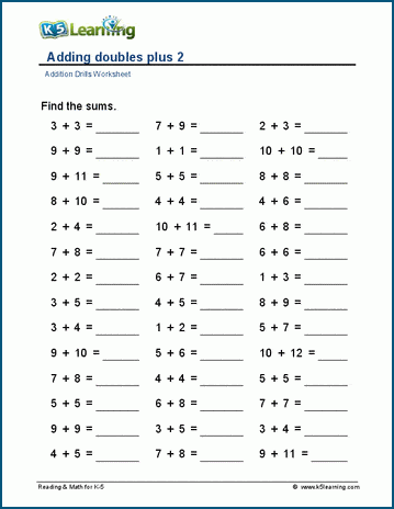Students add doubles and doubles plus 2 (e.g. 4 + 4, 4 + 5) with addends from 1-10. Horizontal and vertical formats. Practice after mastering adding doubles.