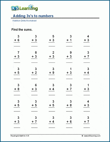 Worksheet #1Students add three to numbers between 1 and 12. The first worksheet is a table of all addition facts (1-12) with three as an addend.