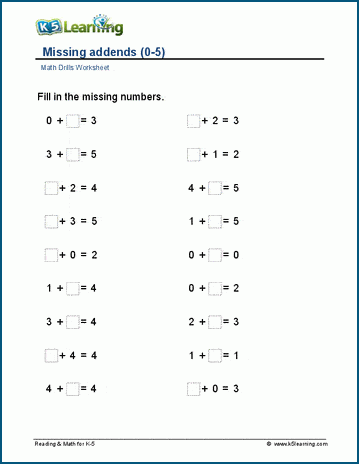 Addition facts worksheets with missing addends; all sums are less than or equal to 5.