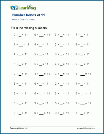 Students fill in the missing addends in equations with sums of 11-15. Number bond worksheets provide focused practice on related math facts.