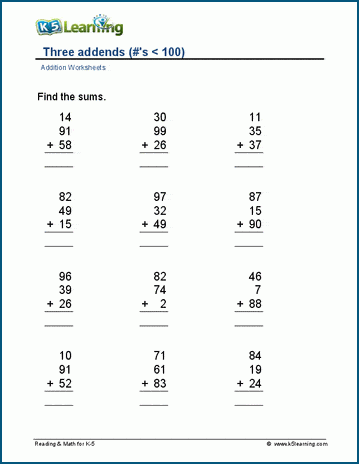 Students add three numbers (0-99) in these addition worksheets. Equations are in vertical format.