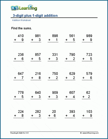 Addition exercises with single digit numbers added to three digit numbers. Lots of practice in regrouping ones to tens. In vertical format with 25 or 49 questions per worksheet.