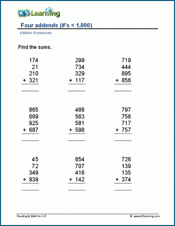 Addition equations with 4 addends and numbers up to 1,000. Equations are in vertical format.