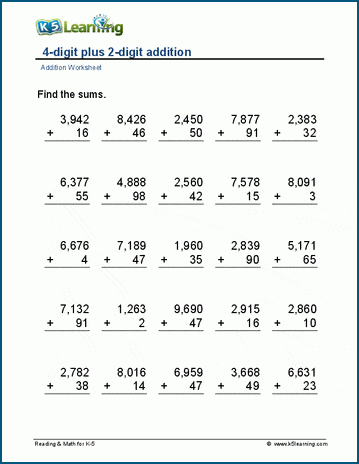 Addition exercises with 1-2 digit numbers (1-99) added to numbers with up to 4-digits (100-9,999). In vertical format with 25 or 42 questions per worksheet.