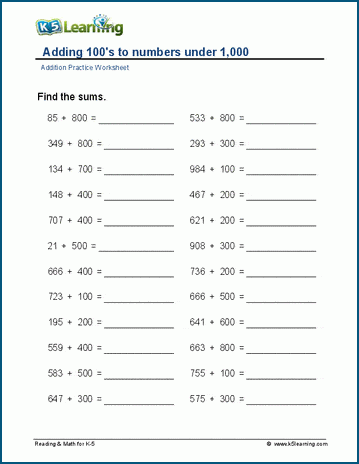 Students add whole hundreds (100, 200 ...) to random numbers under 10,000 in horizontal form. Mental regrouping of hundreds into thousands is required.