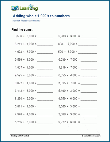 Students add whole thousands (1,000, 2,000 ...) to random numbers under 100,000 in horizontal form. Mental regrouping of thousands into tens of thousands is required.