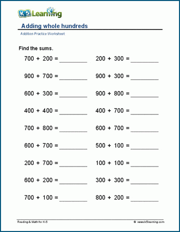 Addition worksheets focused on adding whole hundreds (e.g. 500+300) with addends under 1,000 and only two terms.
