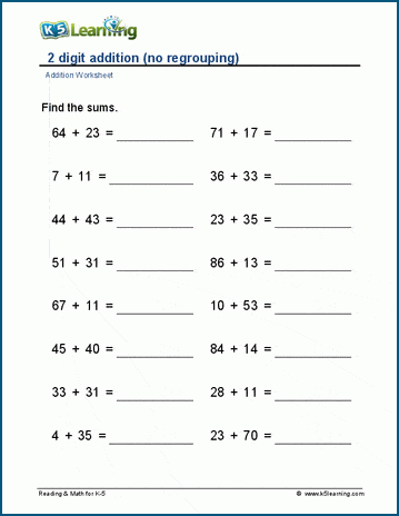 Students add 2-digit numbers together in horizontal form, without any need for regrouping. These exercises the use of place value concepts in addition.