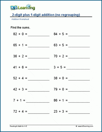 In these addition worksheets, students add 2-digit and 1-digit together in horizontal form, without regrouping. A good exercise to get students used to calculating with larger numbers "in their heads".