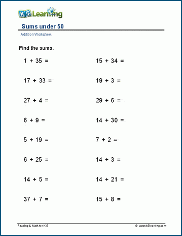 Addition worksheets in horizontal form with all sums under 50. Students will have to mentally regroup ones into tens.