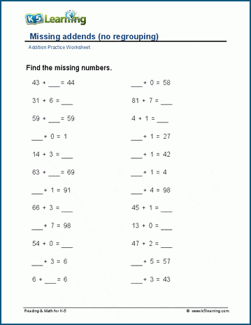 Students find the missing addends; exercises have a 1-digit number added to a 2-digit number and no regrouping is required.