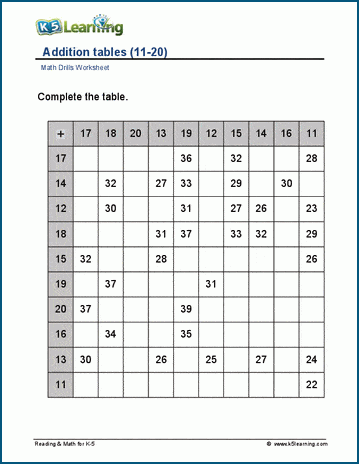 These addition tables provide practice in 2-digit addition with addends between 11 and 20. Each table has 100 questions.