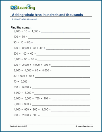 In these addition worksheets, students add whole tens, whole hundreds and whole thousands together. Up to 4 terms per equation; all exercises in horizontal format.