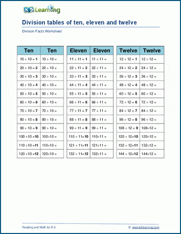 Students practice dividing numbers by 10, 11 or 12. The first worksheet is a table of all division facts with a 10, 11 or 12 as a divisor.