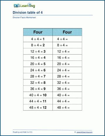 Students divide numbers up to 48 by 4. The first worksheet is a table of all division facts with four as a divisor.