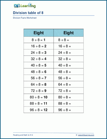 Students divide numbers up to 96 by 8. The first worksheet is a table of all division facts with eight as a divisor.