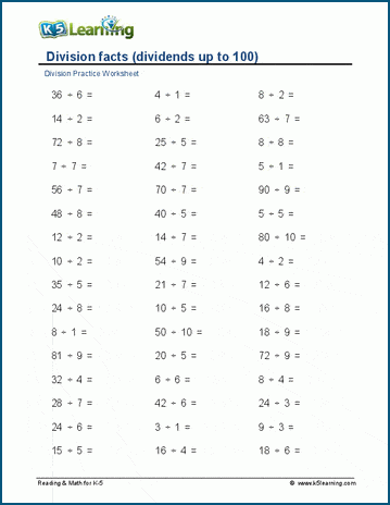 Division facts with divisors of 1-10 and dividends up to 100 in horizontal format. 48 or 100 questions per worksheet.