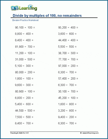 These division questions have divisors which are multiples of one hunder (100, 200, 300 ....) and dividends up to 100,000. Quotients do not have remainders.