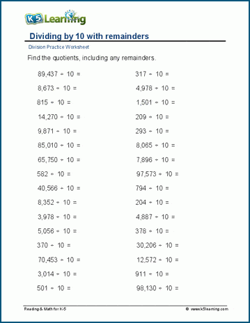 In these horizontal division worksheets, students divide numbers up to 1 million by 10 or 100; most quotients will include remainders.