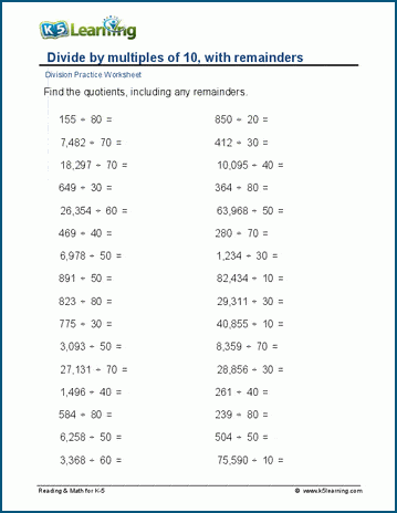 Division worksheets with all divisors being multiples of ten (10, 20, ....); quotients will include remainders.