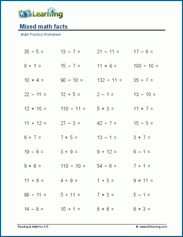 Mixed math fact practice in horizontal form with addends, factors etc in the 1-12 range (sums and minuends of 24 or less; factors and dividends of 144 or less).