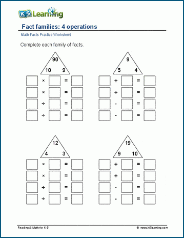 Students write sets of related math facts. These fact family worksheets demonstrate the relation between addition and subtraction or between multiplication and division.