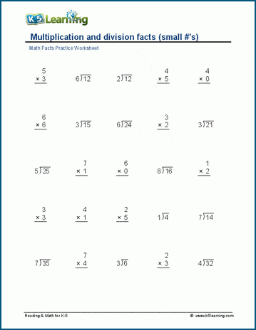 Students solve mixed multiplication and division facts with small numbers (factors of 7 or less and dividends no greater than 48). Exercises are in vertical orientation.