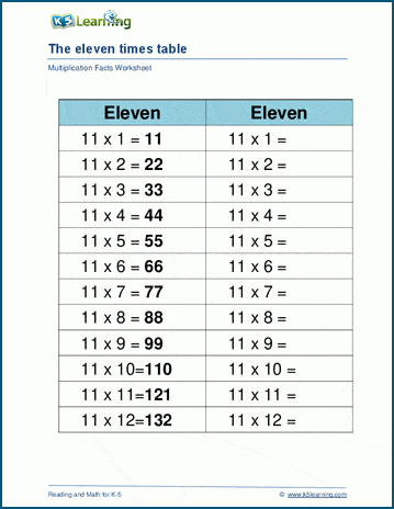 Students multiply 11 times numbers between 1 and 12. The first worksheet is a table of all multiplication facts (1-12) with eleven as a factor.
