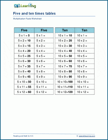 Students multiply 5 or 10 times numbers up to 12. Worksheet #1 is a table of all multiplication facts with five or ten as a factor.