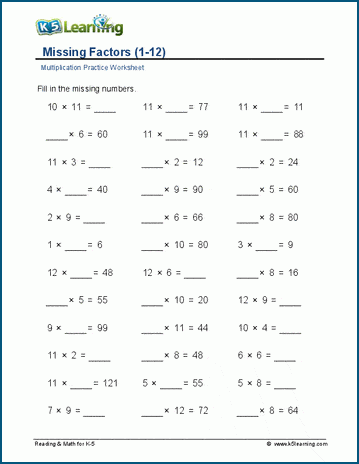 Multiplication facts worksheets with missing factors; all factors are less than or equal to 12.