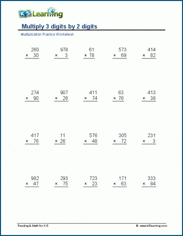 Multiplication practice worksheets with numbers up to 1,000 multiplied by numbers up to 100, all in vertical form.