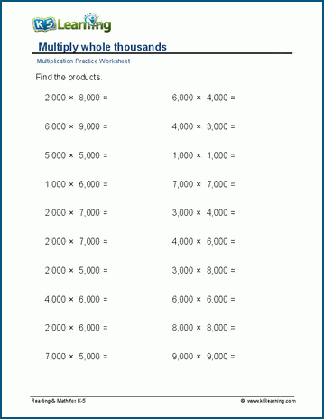 Students multiply whole thousands by whole tens, hundreds and thousands.