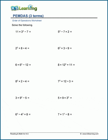 Order of operations worksheets including parenthesis and exponents. These questions have 3 terms.
