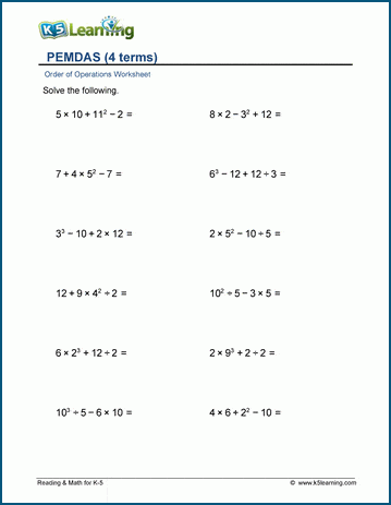 Order of operations worksheets including parenthesis and exponents. These equations have 4 terms.