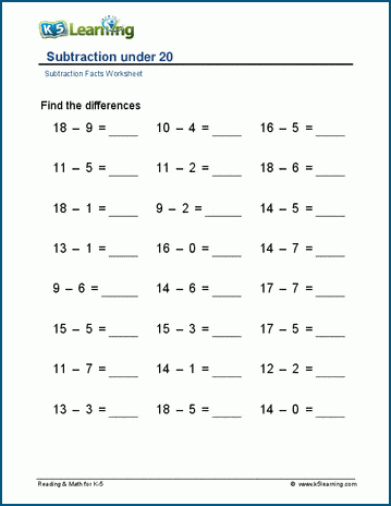 Subtraction practice worksheets with all numbers under 20 and questions in horizontal form. Regrouping of tens into ones will be required in many questions.