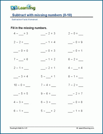 Students fill in the missing minuend, subtrahend or difference in these subtraction facts worksheets.