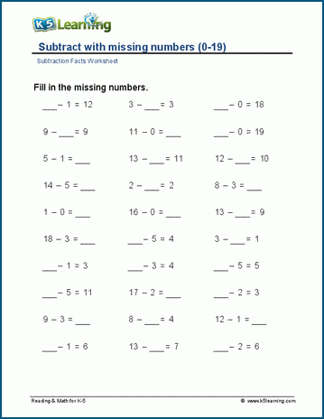 In these single digit subtraction worksheets, students find the missing minuend,. subtrahend or difference. Minuends range from 1-20.