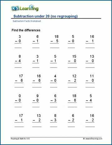 Subtraction practice worksheets with all numbers under 20 and no regrouping. Vertical form.