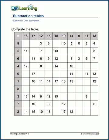Worksheet #2Randomly ordered subtraction table with minuends of 9-18 and subtrahends of 0-9. Students practice subtraction by filling in the missing differences.