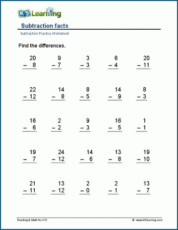 Basic subtraction facts with differences of 0-12, vertical format. 25 or 64 questions per page. Practice to improve accuracy and speed.