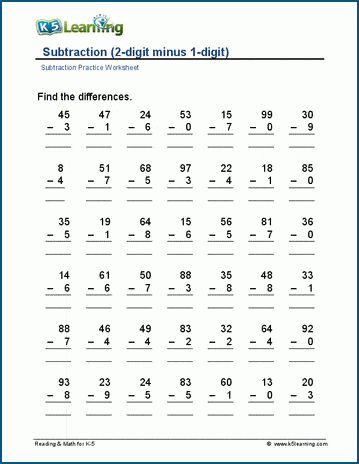 Subtraction worksheets with single digit subtrahends (0-9) being subtracted from minuends up to 99. Some questions require regrouping; all questions in vertical form.