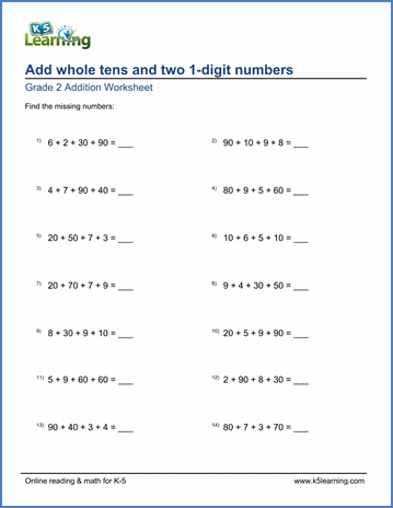 Our grade 2 math worksheets on adding two whole tens and two 1-digit numbers.