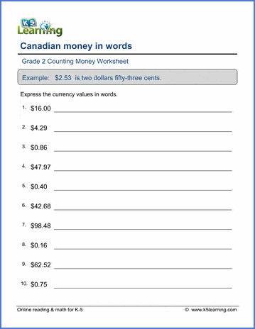 In these money worksheets, students write currency values in words.