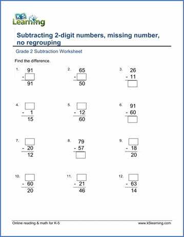 Grade 2 subtraction worksheet on subtracting a 2-digit number from a 2-digit number in columns, with missing numbers.