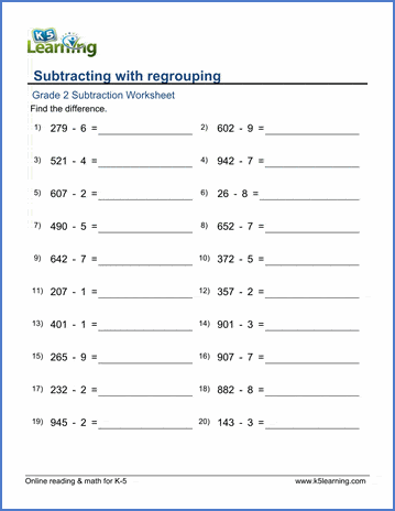 In these grade 2 math worksheets, students subtracting a 1-digit number from numbers up to 999; some answers cross the ten and require borrowing (or regrouping).