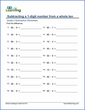 Students subtract 1-digit numbers from whole tens. All questions will require regrouping.
