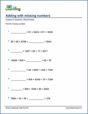 Students complete the equation by finding the missing number. Each addition equation has 4 addends.