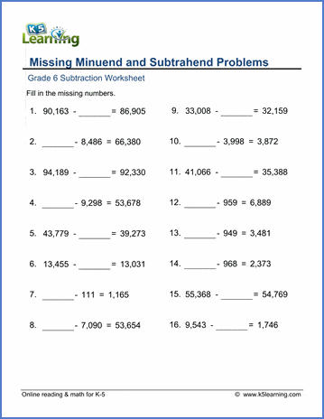 Students find the missing minuend or subtrahend to complete the subtraction equation. Numbers up to 99,999 are used and all differences are positive (no negative numbers).