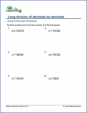 Grade 6 math worksheets on long division of large decimal numbers by 1-digit decimals. Quotients should be rounded to 6 digits if needed.